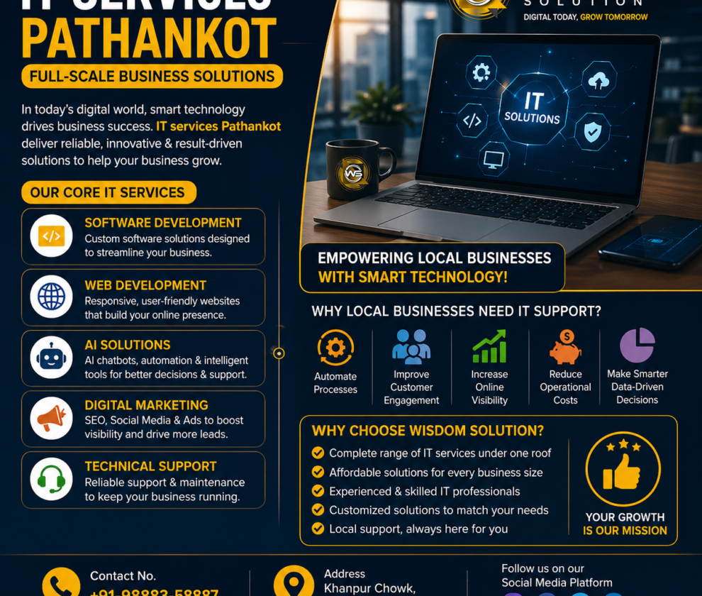 If you’re looking for reliable and result-driven IT solutions, Wisdom Solution is here to help you succeed in the digital world. Contact us for IT services in Pathankot
